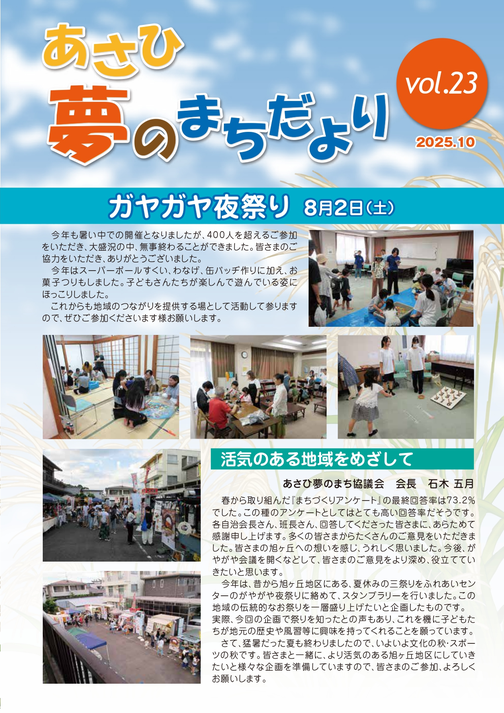 vol.23では、ガヤガヤ夜祭りや旭丘地域の夏祭り、おしゃべりカフェ、Q-Renやお手軽スポーツ講座など、令和7年度の前半に実施した事業をまとめて報告しました。是非ご覧ください。